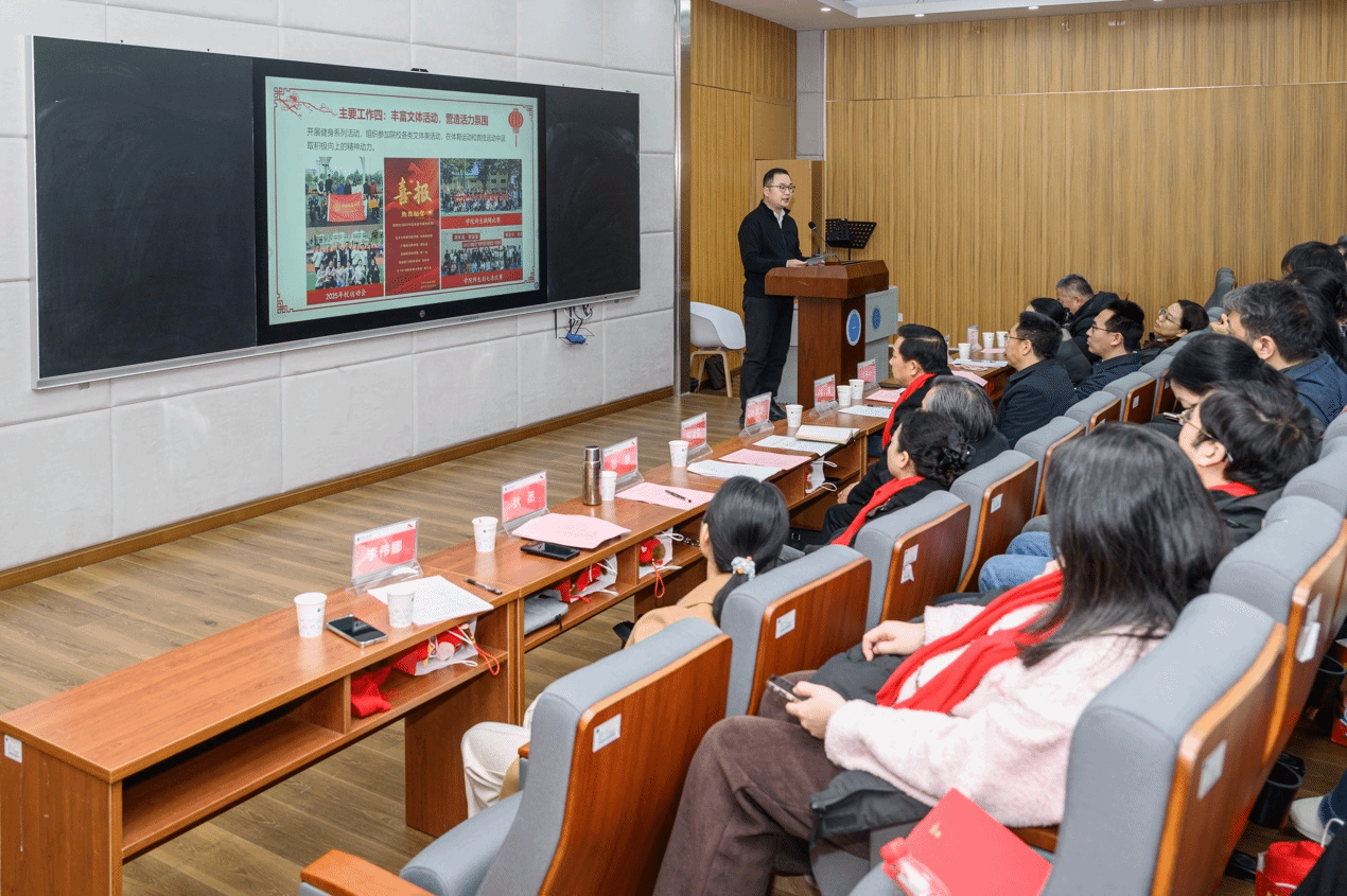 分工会主席程璜鑫作2025年工会工作报告。他从民主管理、职工成长、生活关怀、文体活动、服务师生等方面介绍了年度工会工作情况。他表示,贝博体育