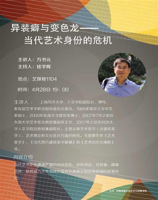 1301室,作了题为《异装癖与变色龙——当代艺术身份的危机》的专题讲座。桂宇晖院长主持了此次讲座,武汉大学杨雪松教授、武汉理工大学雷鑫博士等参加了此次讲座。