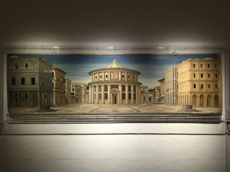 步行到乌尔比诺公爵府的途中,经过了文艺复兴著名建筑大师普勒曼特设计的多摩大教堂。公爵府邸改造的马尔凯美术馆,内部珍藏了包括皮耶罗·德拉·弗朗切斯卡的《被鞭挞的耶稣》、《塞尼加利亚的圣母》,和《亚历山大的加大肋纳》,以及保罗•乌切洛的真迹。其中拉沃拉那尤为重要,他在探索直线透视法方面取得了突出成就,为文艺复兴时期绘画的发展作出了很大的贡献。意大利城市建筑规划始于文艺复兴,在这之前的中世纪房屋是随地形修建。美术馆主要的藏品那沃拉那的《城市规划图》,是文艺复兴城市改造最具代表性的作品,标志欧洲透视学的诞生。拉斐尔的《慕塔》历经三年的修复,这次重新公开展出。参观完美术馆,大家来到了乌尔比诺的最高处俯瞰整个城市,感受它跨越数百年经久不衰的魅力。