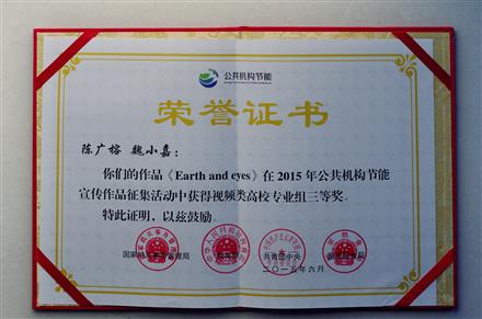 贝博体育 代表学校参加2015年公共机构节能宣传作品征集活动,获评“优秀组织奖”,研究生陈广榕、魏小嘉的作品《Earth and Eyes》获得视频类高校组三等奖。本届大赛由由国家机关事务管理局、教育部、团中央、国家粮食局联合举办,涉及节水、节电、节粮以及节能环保等主题。