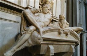 美第奇家族教堂的建筑设计 米开朗基罗的雕塑——《暮》(左)和《晨》(右)
