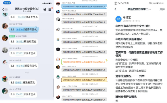 学工组在疫情爆发之初,迅速建立学工组—班级安全负责人—班级学生的三级联络机制,同时配套了辅导员—年级学生骨干—年级学生,辅导员—年级重点关注对象—年级重点关注对象联络人两条辅助沟通渠道。完善每一个学生的通讯录和紧急联系人通讯录,确保随时需要随时联系。坚决落实每日健康打卡制度,各年级辅导员全面了解疫情期间学生们的身心健康、学习状态及思想状况,重点关注港澳学生群体、留校学生群体、出国出境学生群体、疫情严重地区学生群体,并且做好工作台账,每日小汇报,每周大总结。辅导员、班主任、学务指导老师深入了解学生情况,学工组全体成员24小时待命,及时处理突发情况,动态跟进,站好疫时安全岗。