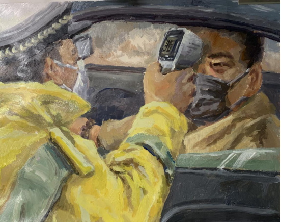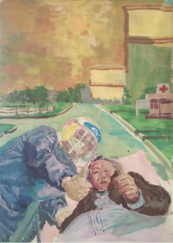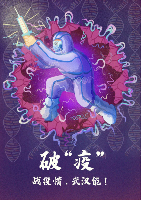 (设计说明:这副作品通过明暗、色彩饱和度对比来突出了医生与病毒之间的抗争。左下角代表祖国的大好河山,医生用脚步走遍且不间断的前行,不问归期。而在画面上方是黑暗的病毒,医生的到来燃起生命的光芒,驱赶着这些病毒…这副作品表达了对医务人员的赞叹和暗示他们的光明前程。)