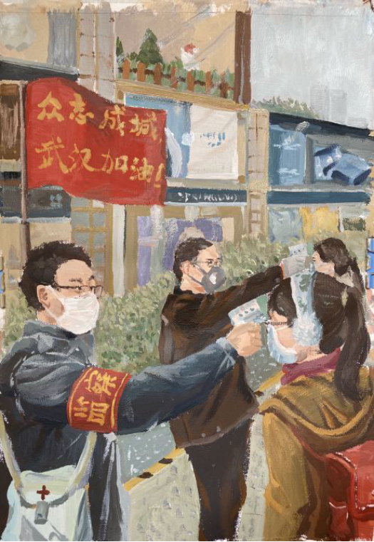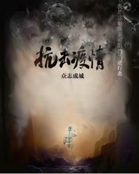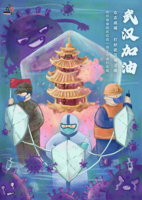 (作品说明:在当下抗击疫情的日子理,有这样一些人,舍小家、为大家,不顾个人安危,勇敢"逆行”。他们的精神深深感动了我,他们来自各行各业,有奋战在疫情一线的医院医生与护士,每天与病魔缠斗,被口罩勒红的伤痕是他们的勋章。加紧建造临时医院的工程人员,快马加鞭的为病人构筑生存的空间,还有一线民警,在关键时刻坚持上岗,维护社会秩序。这些是这群逆行者中的少部分人,但却是有代表性的人,因此我选取了他们的形象,代表这群最美逆行者,加以中国版图作为背景,寓意我们一定能合力齐心,战胜病魔!武汉加油,中国加油!)