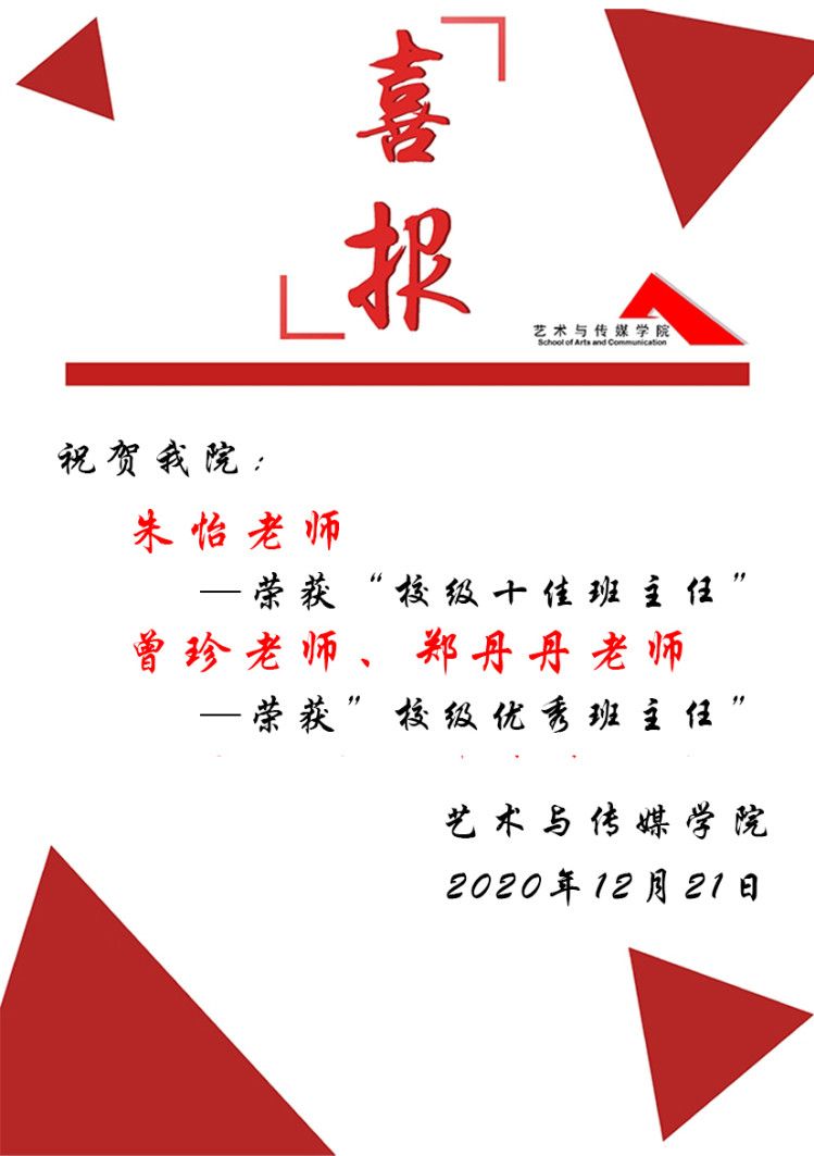在我校开展的“2020年全校‘十佳班主任’和‘优秀班主任’评选活动”中,经个人申报、贝博体育 推荐、学校优秀班主任工作小组审核和网上公示,共评选出10名老师获得校级“十佳班主任”称号、30名老师获得校级“优秀班主任”称号。其中,贝博体育 有3名老师在此次评选活动中脱颖而出:朱怡老师荣获校级“十佳班主任”称号、曾珍、郑丹丹老师荣获校级“优秀班主任”称号!