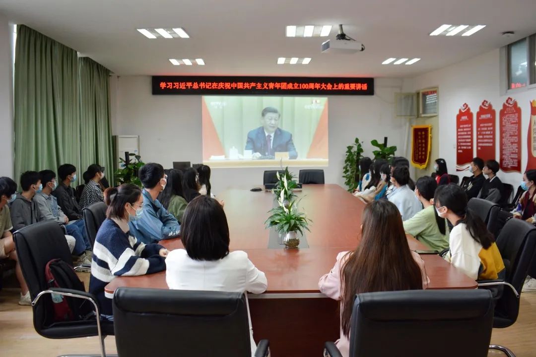 党委书记郭秀蓉、党委副书记边建华、辅导员陈习良、辅导员曾戈晖、兼职辅导员、学生会、研究生会、党建办学生骨干共同在艺媒楼1209会议室观看庆祝中国共产主义青年团成立100周年大会直播。