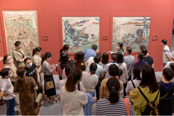 连接一楼至二楼展厅的长廊中,精美的供养人形象的壁画诉说着从北朝至清代千余年来敦煌石窟的繁荣礼佛景象。至二楼展厅,首先使人醒目的是三幅高大的唐代佛法图,侧旁附有众所熟知的《鹿王本生图》以及水月观音等小幅壁画。待参观完悬挂平面壁画后,老师们跟随讲解进入了其中一个实景复原洞窟内,此窟内将西域佛教与中国传统风格进行了极高的艺术融合,覆斗式的窟顶和各色彩幡使观者仿佛置身于千年前的佛教盛况之中,惊叹于古代劳动者高超的艺术水准。