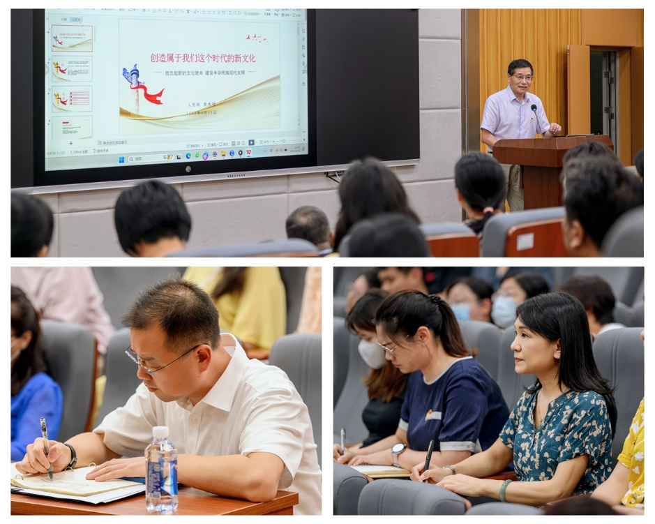 党委书记晋曦同志就报告内容进行了总结发言。本次讲坛以习近平总书记在文化传承发展座谈会上的重要精神为主线,以创造属于我们这个时代的新文化为主题,理论含金量足、学术启发性强,既是一次武装头脑的主题教育辅导报告,也是启迪我校师生学科建设和人才培养的学术指引报告。