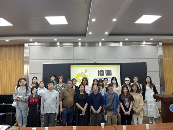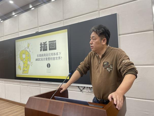 副院长杨喆主持,主讲人为深圳市插画协会会长、全国插画双年展策展人朱求真。