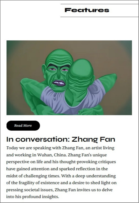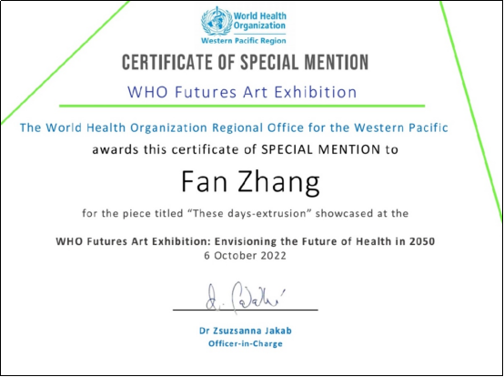 张帆副教授的访谈及作品。2022年,张帆副教授作为唯一一位来自中国的艺术家参与了世卫组织西太平洋区办事处的艺术项目“WHO Futures Art Exhibition”,作为该艺术项目的组成部分,世卫组织西太平洋区办事处对张帆副教授进行了专访并于近日在专题报道中刊发了部分访谈内容。专访中张帆副教授与对方探讨了艺术家的创作;“COVID-19”对世界及人类社会的影响;如何改善解决生态环境问题;艺术对创建健康未来社会的作用以及疫情影响下艺术家个人生活状态等议题。张帆副教授的作品曾在多个国家展出并发表收录于多部国际艺术出版物,近年来欧洲多个国家的艺术杂志及网站也相继对张帆副教授进行了专访并全文刊发了访谈内容及部分作品。
