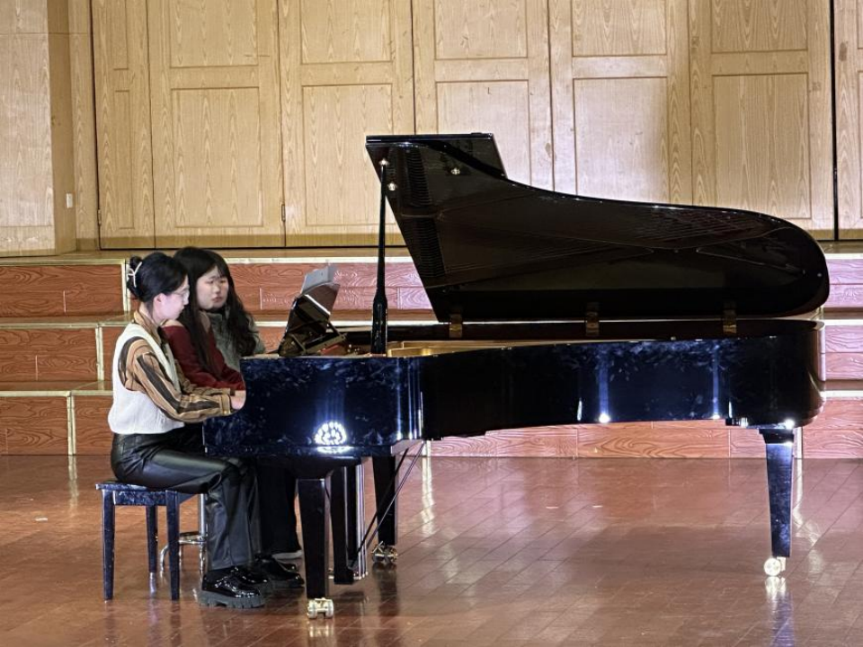 四手联弹德沃夏克的《斯拉夫舞曲第五乐章》让观众们感受到了典型的捷克舞曲节奏风格,淳朴、欢快、热烈的民族风格令人耳目一新。在表演中,节奏多模拟斯卡契那中的转圈舞步,情感热烈,动力强劲,整曲的情感基调更是欢快热情。