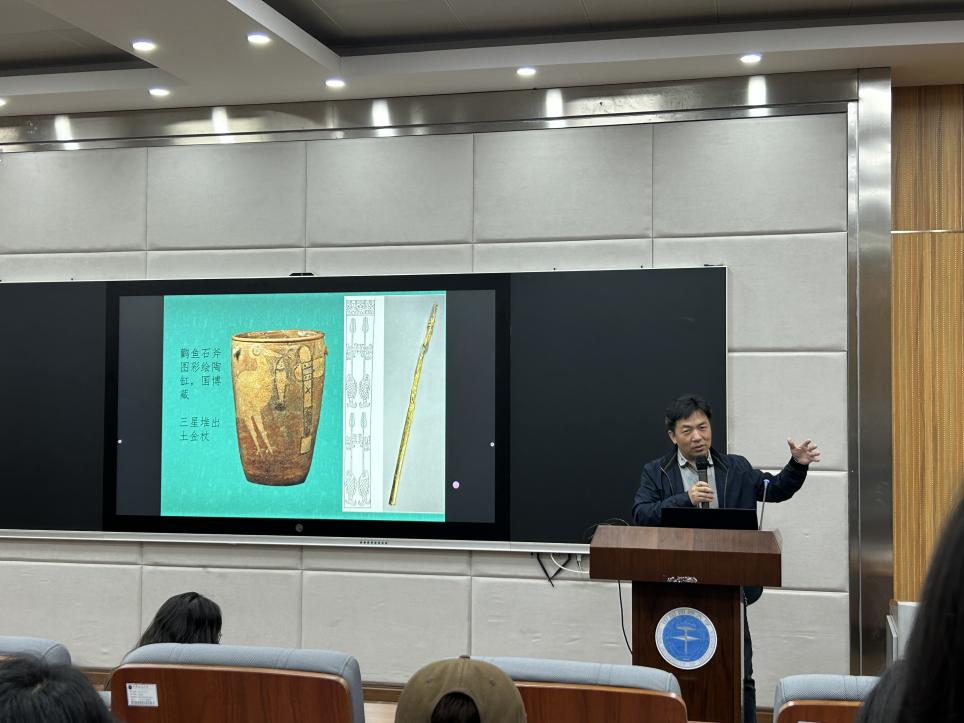 讲座围绕文字图像学符号学研究的历史以及应用展开,内容环环相扣。练教授首先用大家所熟悉的新石器时代的鹳鱼石斧图彩绘陶缸以及三星堆的权杖作为开场,通过案例告诉大家图案具有丰富的含义,可以起到文字记录的作用,且随着历史时代的不同,同一个符号内容也会蕴含不的含义。