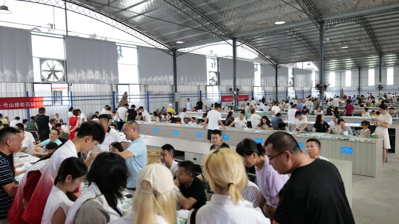 麻家渡银盘河绿松石交易市场占地2200平方米,内设330个摊位,“银盘河”不仅象征着所在地“营盘河”,也寓意着商户们对于幸福生活“拿着银盘来、带着金盆走”的美好愿景。银盘河基地的建成落地是该镇绿松石行业发展中的一个里程碑,来自邻近乡镇的近五百名绿松石从业者纷纷签约入驻,开启各自的“点石成金”之旅。