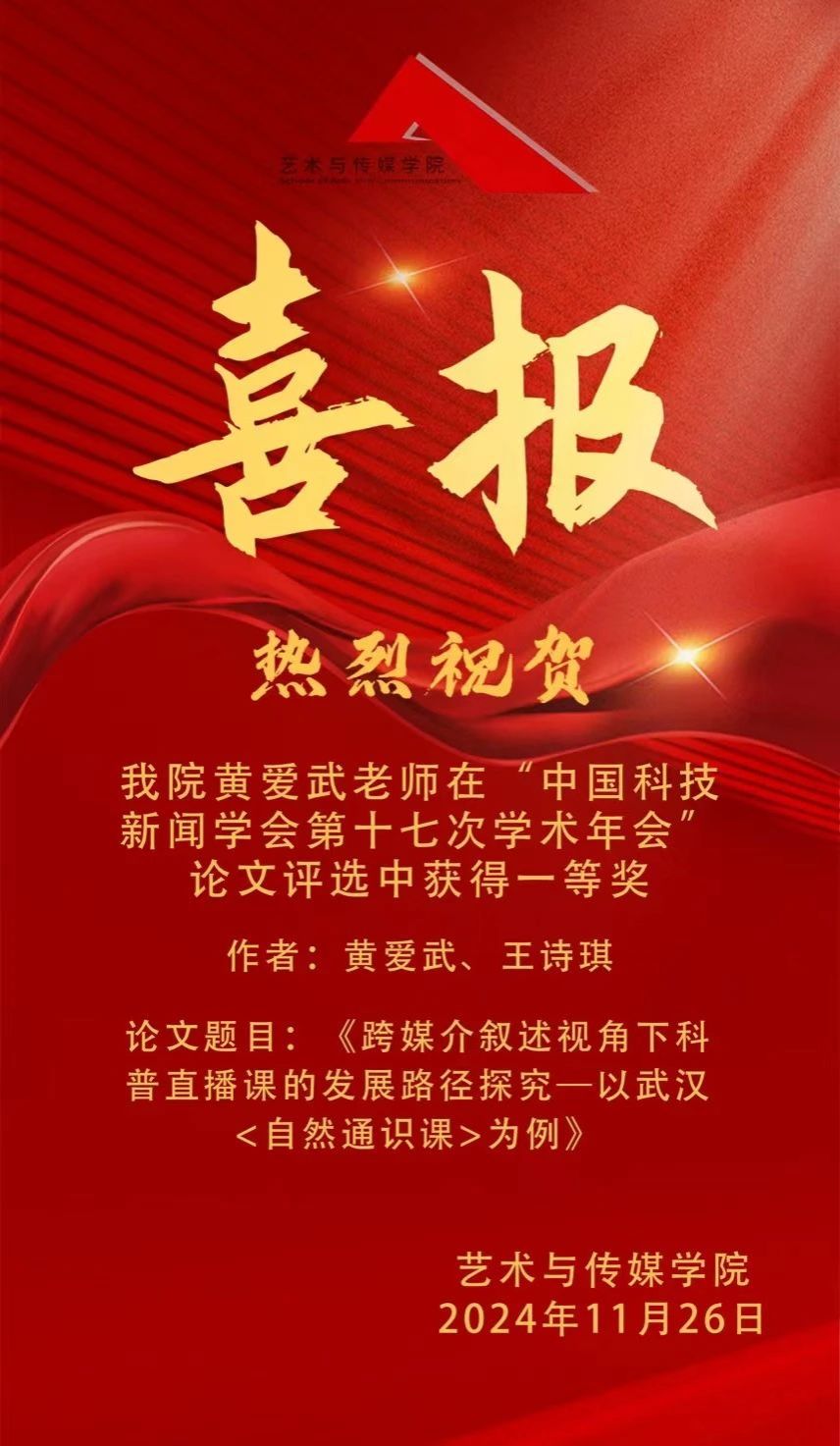 喜报 | 热烈祝贺贝博体育 黄爱武老师在“中国科技新闻学会第十七次学术年会”论文评选中获得一等奖