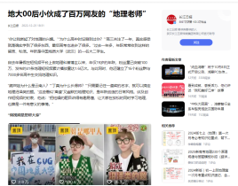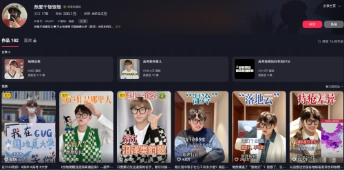 广电专业的在读学生,也是一名抖音地理科普类博主,账号名为“热爱干饭饭饭”,被媒体称为“百万网友的地理课代表”。目前在抖音平台上拥有330万粉丝,发布作品165个,获点赞接近4500万。他的作品以地理知识科普视频为主,善于将地理知识与生活实际、热点话题紧密结合,让原本听起来枯燥的地理知识变得生动、易懂且充满趣味性,也因此收获了大量粉丝喜爱。