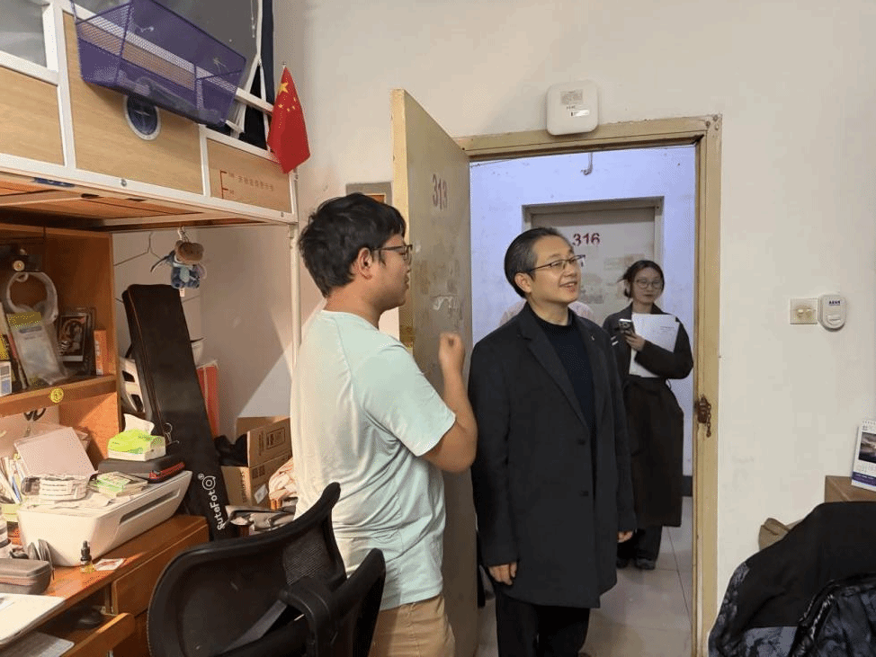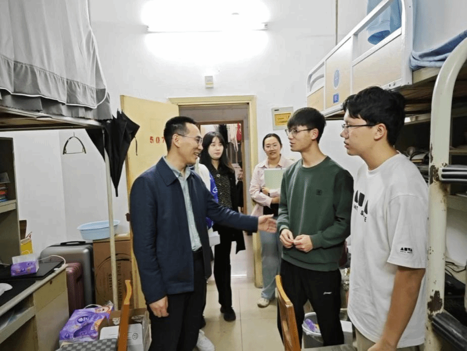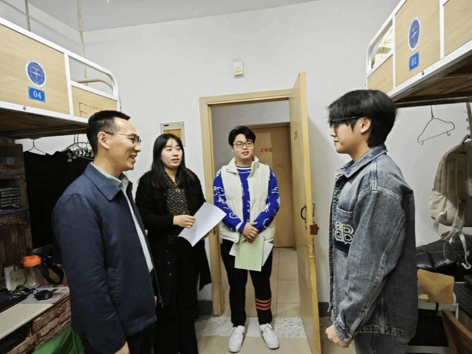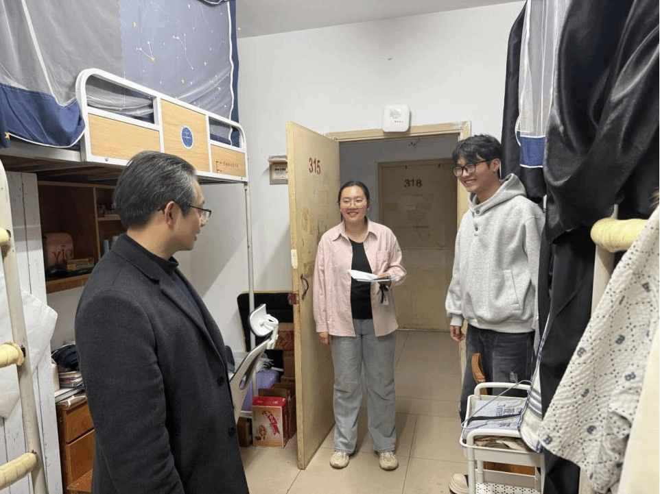 何院长与大二、大三年级学生深入交流,了解同学们学习生活情况。他特别强调同学们在校要注意遵守宿舍管理规章制度,按时归寝;他对部分宿舍存在的卫生状况、安全隐患等问题提出整改意见,嘱托同学们要注意用电安全,禁止使用大功率违章电器。