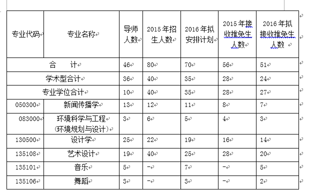在新闻传播学、设计学、环境规划与设计3个一级学科学术学位和艺术设计、音乐、舞蹈(MFA)专业学位类型接收推免生51人,学制3年。具体见下表。