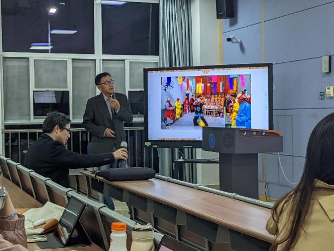 在讲座开始之前,由何清俊院长简单介绍主讲人黄朝斌教授。黄朝斌教授系任中国傩戏学研究会理事、中国艺术人类学学会会员、湖北省动漫协会常务副秘书长、湖北省美术家协会会员,主持完成国家社科基金项目1项,曾多次参与完成省部级以上项目,出版专著《傩言艺语:傩戏面具艺术的传承与创造性转化研究》(人民出版社)。