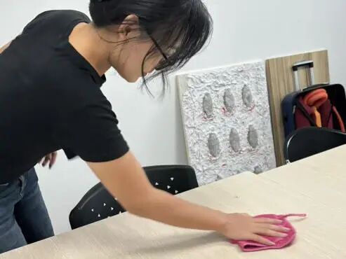工作室整理:协作创未来范冰洁与同门一起打扫设计专业工作室,归类材料、整理工具,体会到“细节决定成败,团队成就精彩”。她期待在新学期中继续保持这份踏实与热情,在专业上不断突破,让创意落地生花。