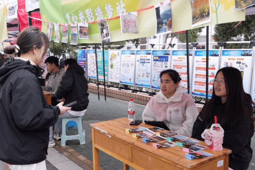 青年志愿者协会在西区体育馆前开展了“掌心光影造梦站”雷锋月主题摆摊活动,用镜头传递温暖,以专业知识服务师生。
