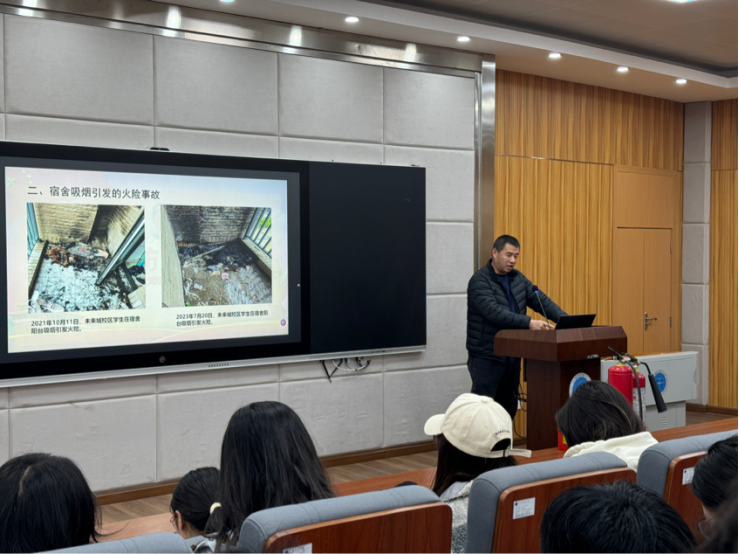 全体本研学生骨干做关于消防安全的主题讲座。学工组全体专兼职辅导员参加本次活动,讲座由学生会秘书部潘爱一主持。