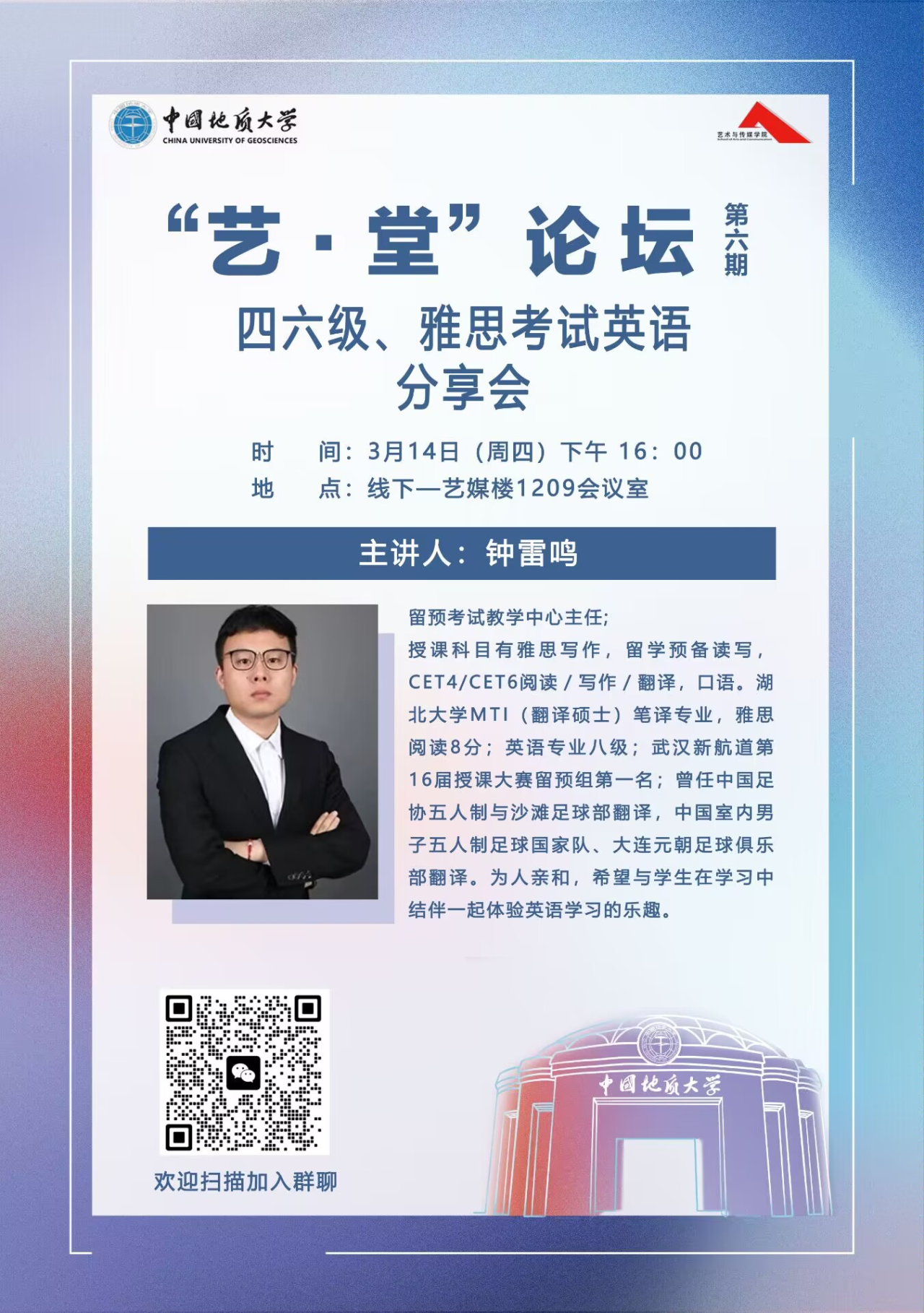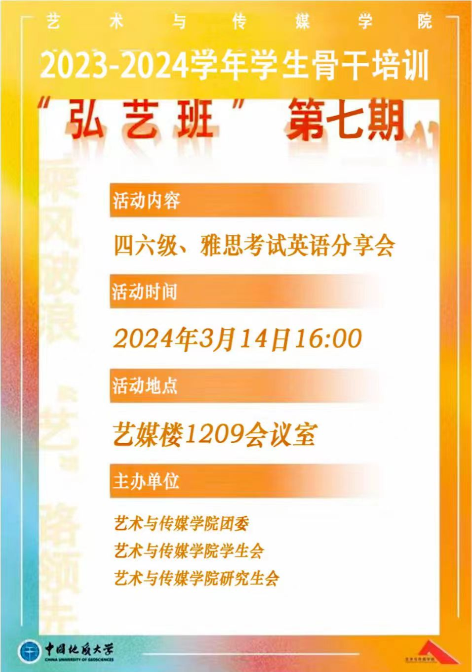 2024年3月14日下午16:00,“艺·堂”论坛第六期四六级、雅思考试英语分享会暨第七期“弘艺班”学生骨干培训于贝博体育