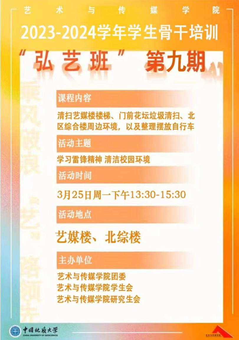 组织学生骨干和学生志愿者开展了2023-2024学年第九期学生骨干培训“弘艺班”暨“学雷锋志愿服务月,清洁校园志愿行”志愿服务活动,引导同学们形成助人为乐、艰苦朴素的思想道德品质。