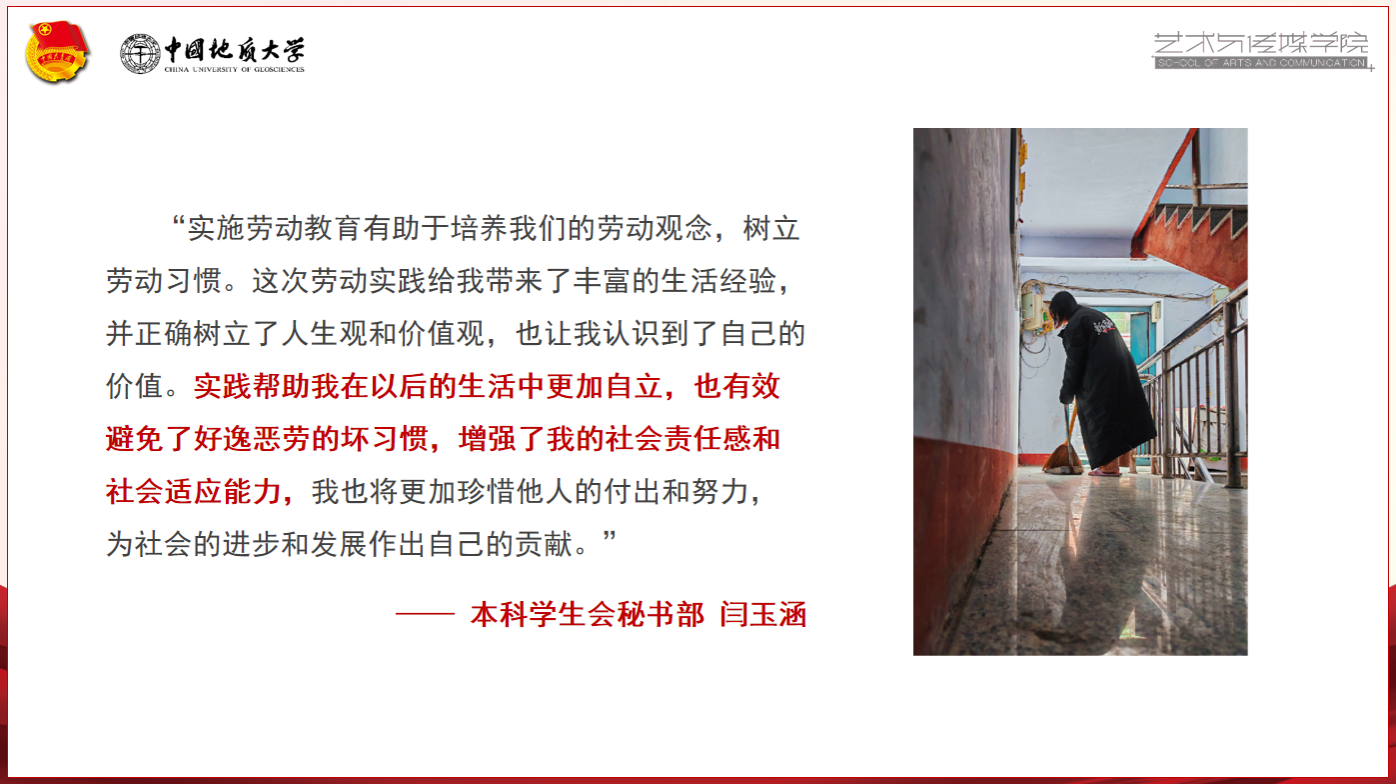 学生干部假期社区志愿服务、家务劳动以及公益授课等具体的劳动实践,引导学生干部崇尚劳动尊重劳动、热爱劳动,以更好地精神面貌投入学习生活与工作。