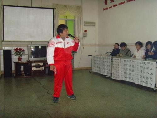 参观过后,同学们同院中残疾儿童们开始联欢。刘禹的一首《为了谁》拉开了联欢的序幕。接下来,五位智障儿童演唱了儿歌《福利院真正好》引得了慰问小组的热烈喝彩。游戏“踩气球”、“击鼓传花”使场上的气氛迅速提升,前来慰问的一行人同智障儿童们互动合作,场上一片欢声笑语。同时,双手残疾的张七一小朋友带来了“清风”,“爱”两幅现场书法作品,让大家看到了残疾儿童身残志坚的精神风貌。另外,在张七一的要求下,这两幅书法作品也作为礼物赠给了前来慰问的同学们。最后,联欢在歌曲《让世界充满爱》划上了圆满的句号。