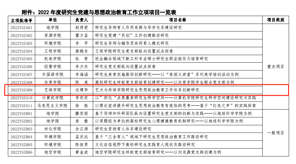 根据前期研究生院和党委组织部研究生党建与思想政治教育工作立项研究项目申报通知的要求,经专家小组评议、研究生院(党委研工部)、 党委组织部审定,2022 年度研究生党建与思想政治教育工作立项项目已经确定并下达,其中贝博体育