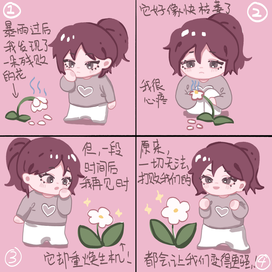 作品描绘了花朵受风雨击打后,不被打败反而重新焕发生机的现象,旨在表达打不倒我们的都会使得我们更加强大,鼓励同学们不惧艰难,历经风雨,方见彩虹。