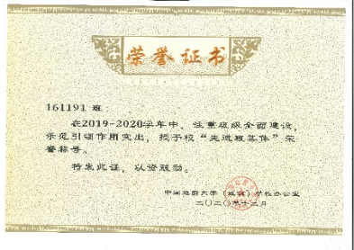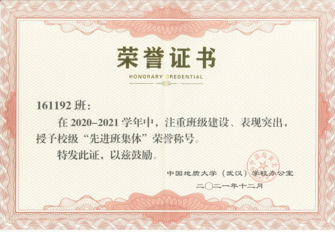 、分院系安排的各项任务,而且能够创造性的开展富有特色的活动。班委会工作最大的特点就是有计划,有制度,有总结。本科四年,161191班获得了2019-2020学年优秀班集体标兵、校级“五四红旗团支部”、2021年度校级先进班集体标兵等荣誉称号。