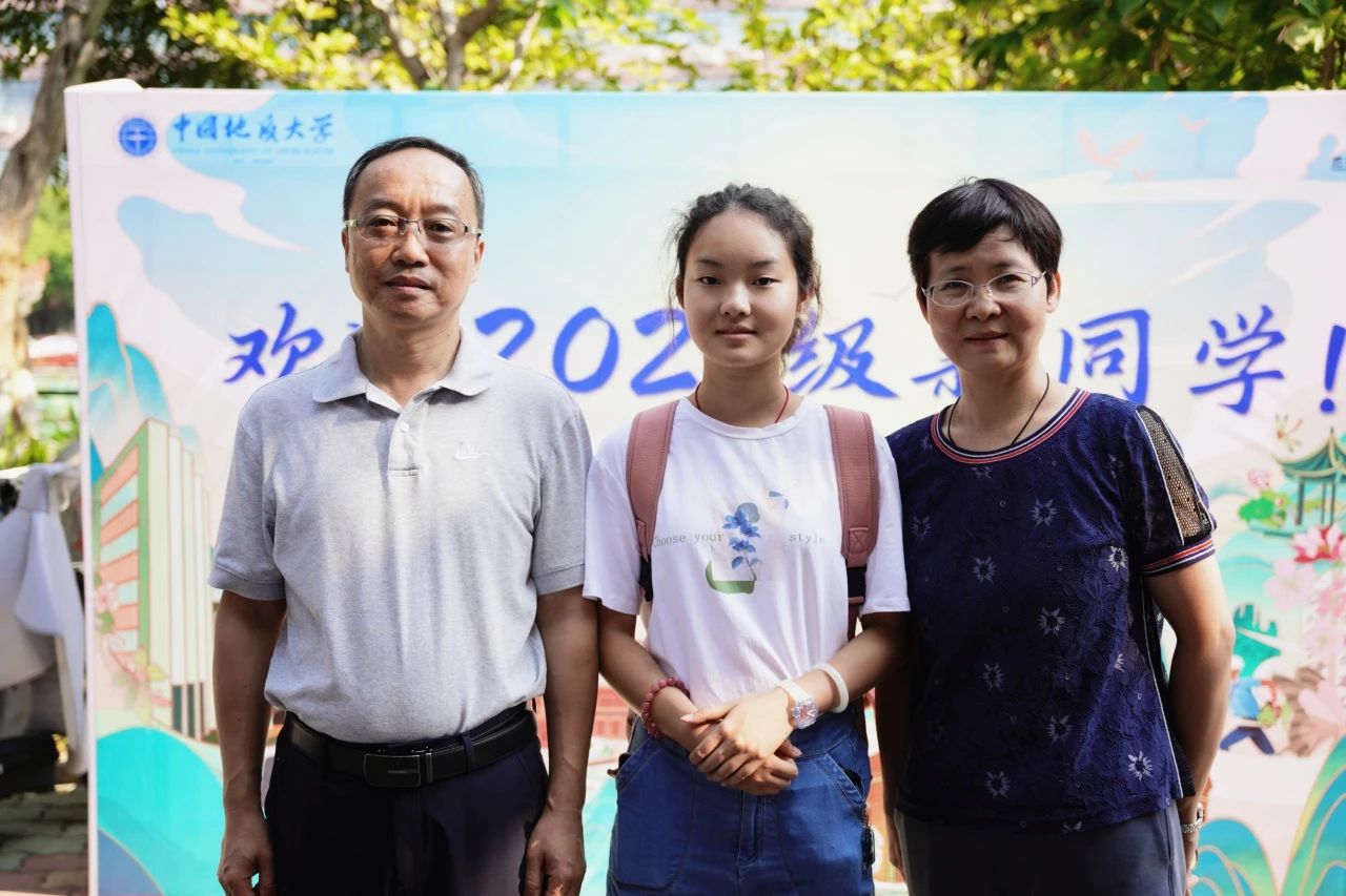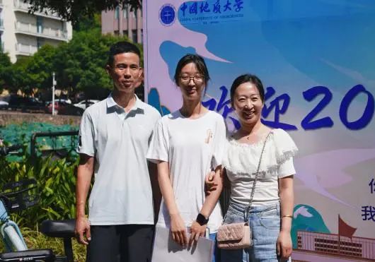的迎新宣传板前同父母合影留念,记录下这一珍贵的时刻。