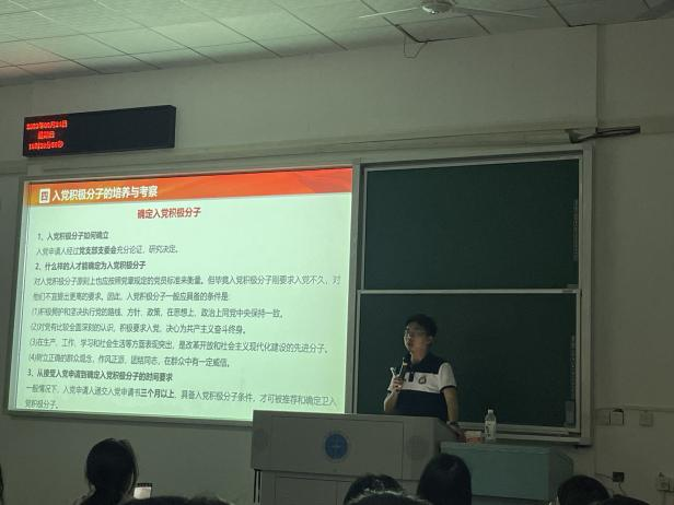 学工组辅导员、党建办公室主任陈习良老师。陈老师向全体新生介绍了学生入党、党员教育等工作。他从“艺术+”党建特色品牌出发,讲解了党组织建设与入党积极分子培训等内容。接着,陈老师就入党申请书的写作要求进行指导,提醒大家端正入党动机,审视自己内心,鼓励大家以实际行动争取入党机会,并得到了许多同学的积极响应。