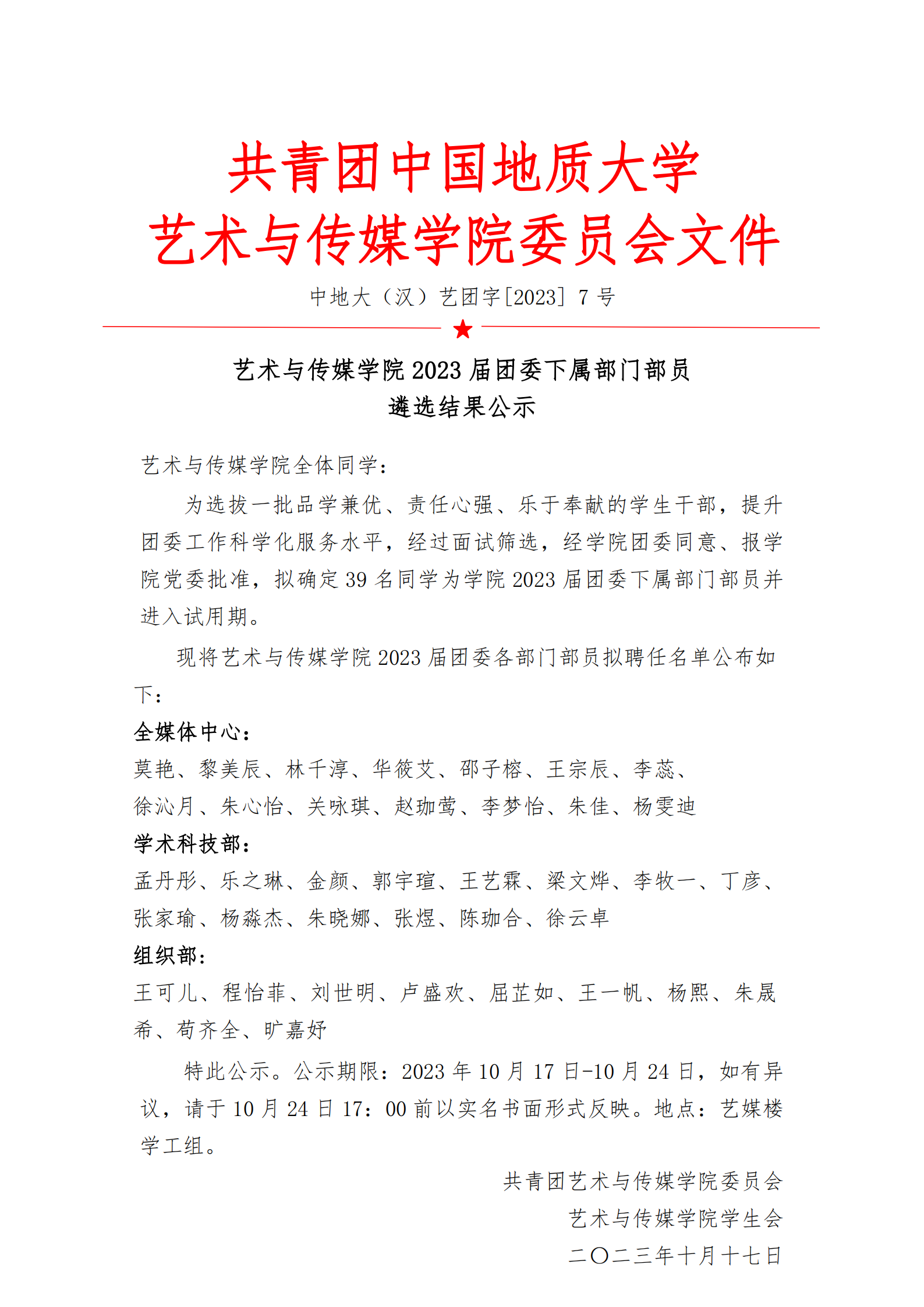 通知 | 贝博体育 2023届团委下属部门部员遴选结果公示