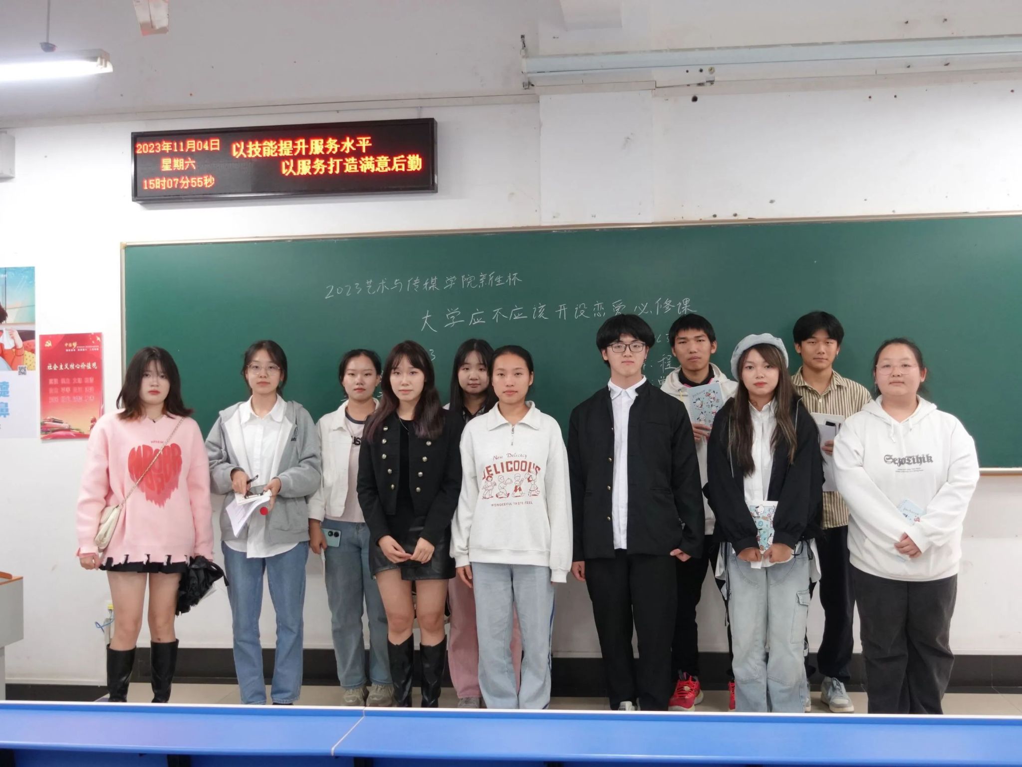 第一场辩论赛在北综楼311举行,由张灿、艾鑫晨露、曹家维担任主评。正方由设计学三班组成,反方由音乐学二班组成。主持人宣布比赛开始后,八位辩手围绕“大学应不应该开设恋爱必修课”展开激烈辩论。反方四辩在质询环节一针见血点出人成长过程中自尊自爱的需求,正方三辩有条不紊的阐述相关观点,赛事异常激烈。最后,评委们就双方存在的问题进行分析指导,提出建议。最终,由音乐学二班代表的反方取得第一场辩论赛的胜利,正方三辩崔雅莉凭借优异的表现获得“最佳辩手”的称号。