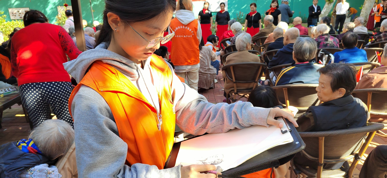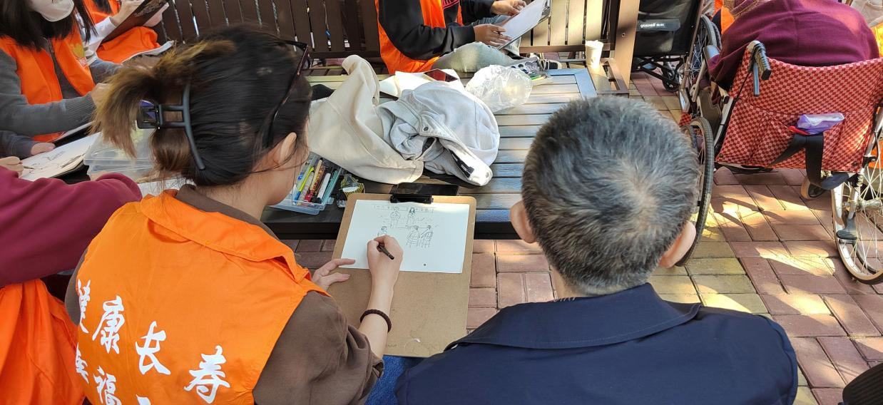 准备活动结束后,志愿者为老人们精心绘制速写画作,捕捉他们的独特风采,每一幅画像都栩栩如生,传神地捕捉了现场其乐融融、温馨无比的画面,这种细致入微的关怀和真挚的付出着实令人感动。