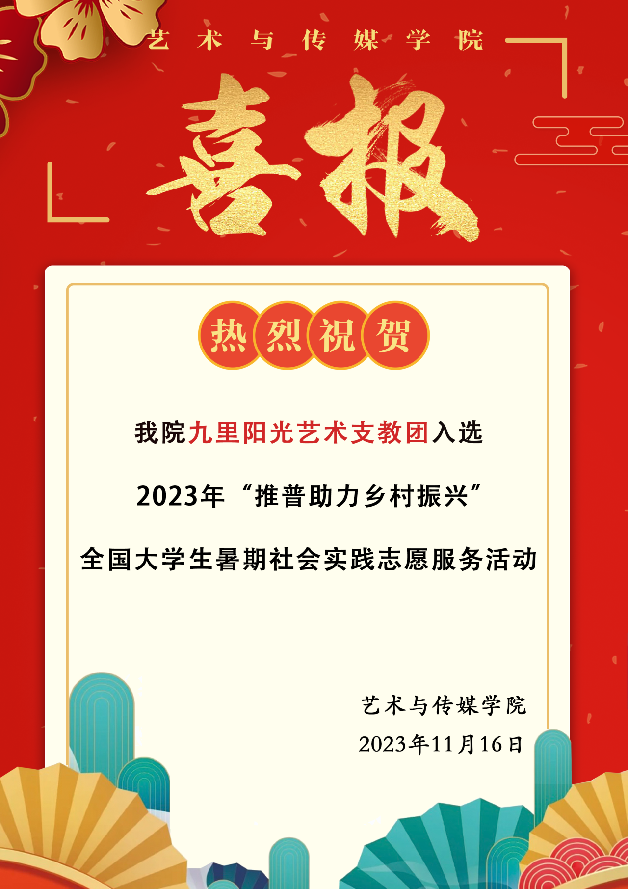 喜报|热烈祝贺贝博体育 九里阳光艺术支教团入选2023年“推普助力乡村振兴”全国大学生暑期社会实践志愿服务活动