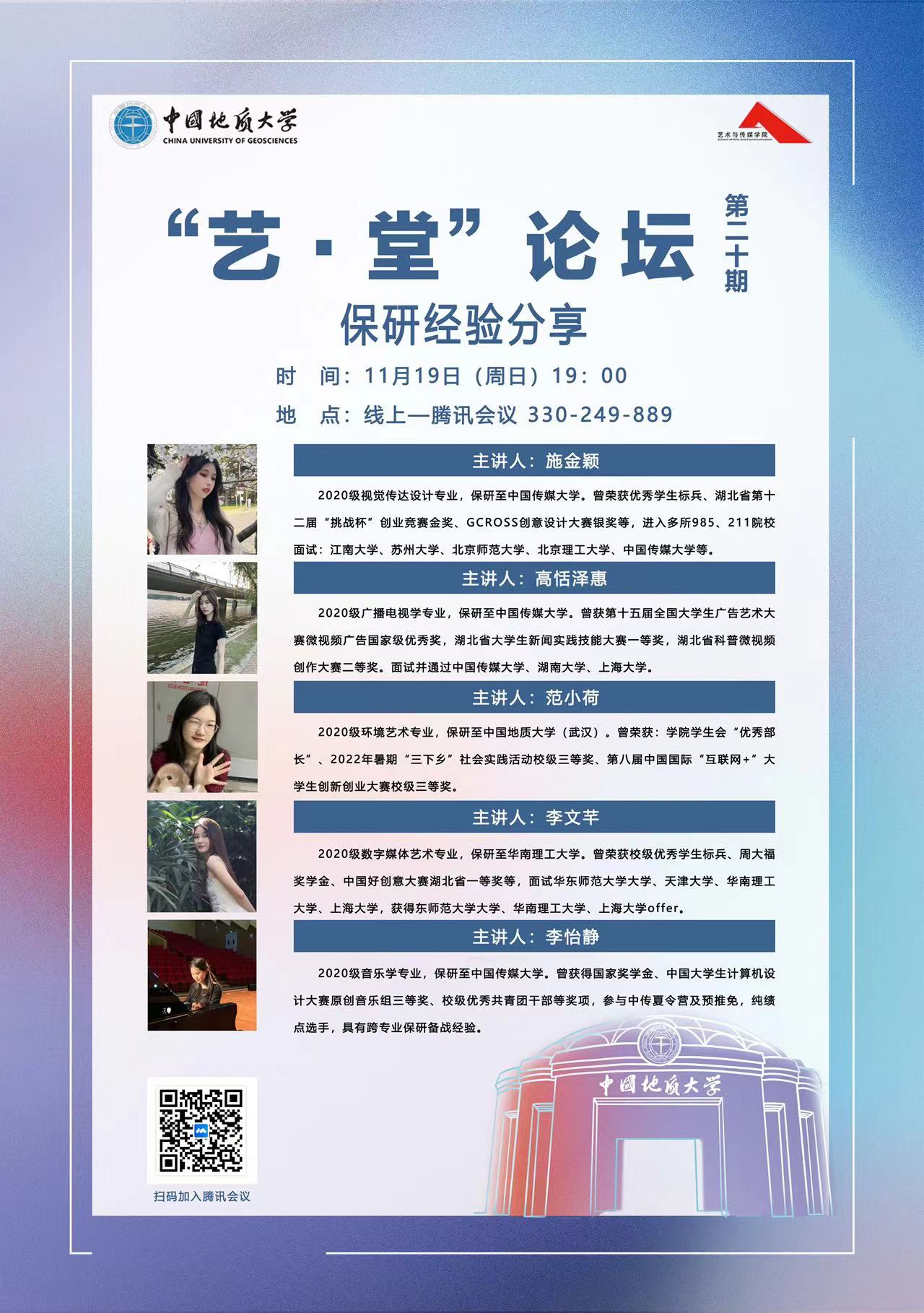 2023年11月19日晚上19:00,“艺·堂”论坛第二十期保研经验分享会于线上腾讯会议平台顺利举行。贝博体育