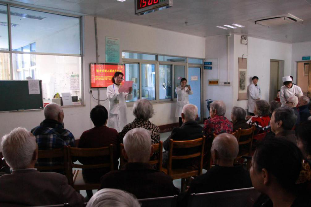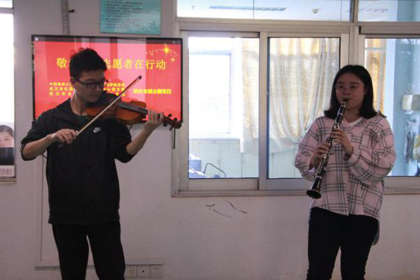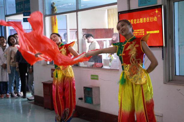 的党员师生为老人们表演了精彩的文艺节目,节目形式多样,精彩纷呈,不仅有传统的舞蹈、合唱,还有独唱、乐器演奏及朗诵,丰富的节目赢得了观众们的阵阵掌声。其中一位来就医半年几乎很少说话的老人表示,师生们的演出很精彩,内容紧跟时代,贴近老年同志,看了很受感动,希望以后多安排这样的活动。