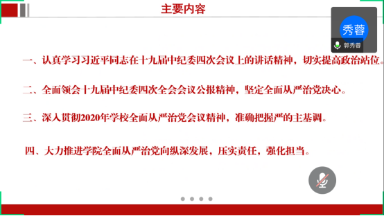 郭书记首先带领全体成员认真学习了习近平同志在十九届中纪委四次会议上发表的重要讲话精神和会议公报精神,接着传达了5月15日学校党委召开的全面从严治党工作会议精神,结合贝博体育