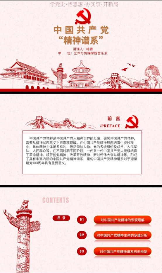 之后,支部组织委员杨青老师结合校党委5月25日下发的理论学习提纲,以“中国共产党'精神谱系'”为题,为大家讲授党课。从中国共产党精神的宏观理解、多维分析和谱系初步构架三个方面入手,初步带领全体党员教师了解认识精神谱系的重要内涵。弄清“我是谁、我姓啥、从哪来、到哪去”,力求永葆共产党人的政治本色,弘扬光荣传统和优良作风,以更加奋发有为的精神状态开拓党和国家事业的光明未来。