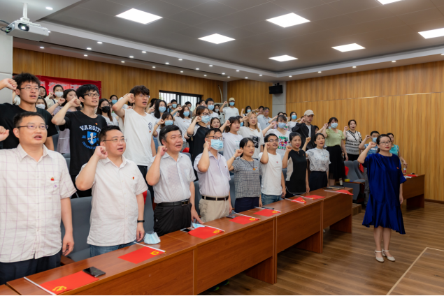 党委书记郭秀蓉的带领下重温了入党誓词。随着现场灯光渐暗,大家的目光逐渐转移到荧幕,开始观看此次庆祝中国共产党成立100周年大会的直播画面。