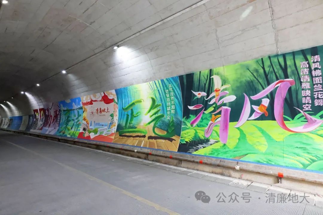 在美丽的校园里,连通西区和北区校园的地大隧道是不少师生课间往返的必经之路。最近,有这样几幅壁画令人眼前一亮:以梅花、荷花、兰花和竹子为意象,组成的“勤政”“廉洁”“清风”“正气”四幅画,围绕在“清廉地大”主图的周围,色彩鲜明,寓意深刻。壁画长22米,高3米,由我校贝博体育