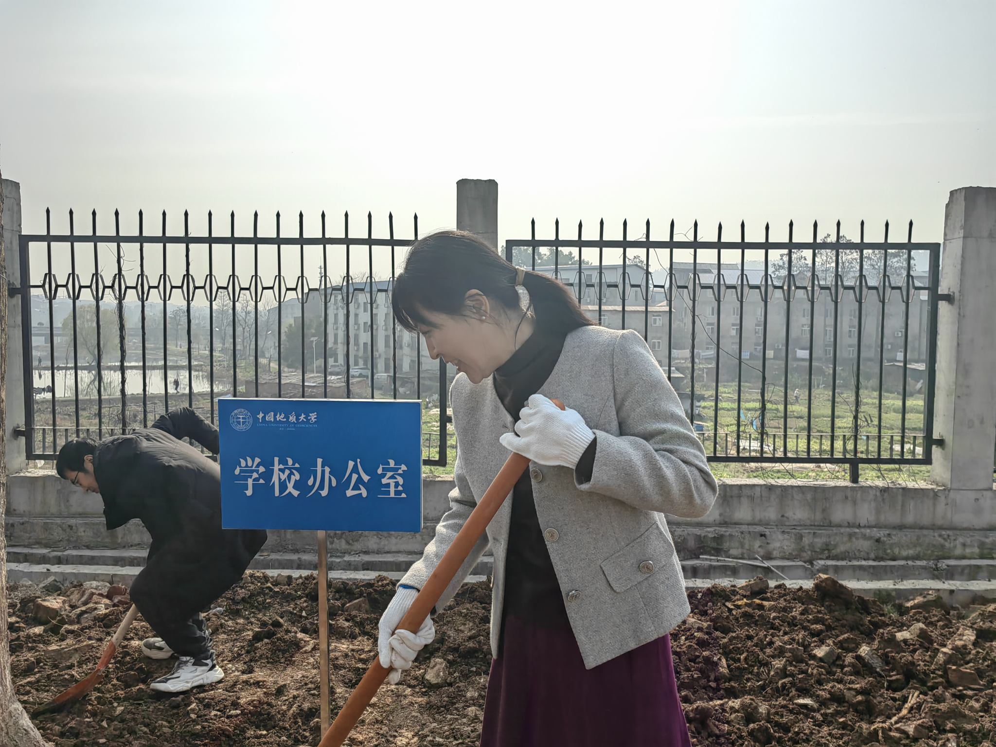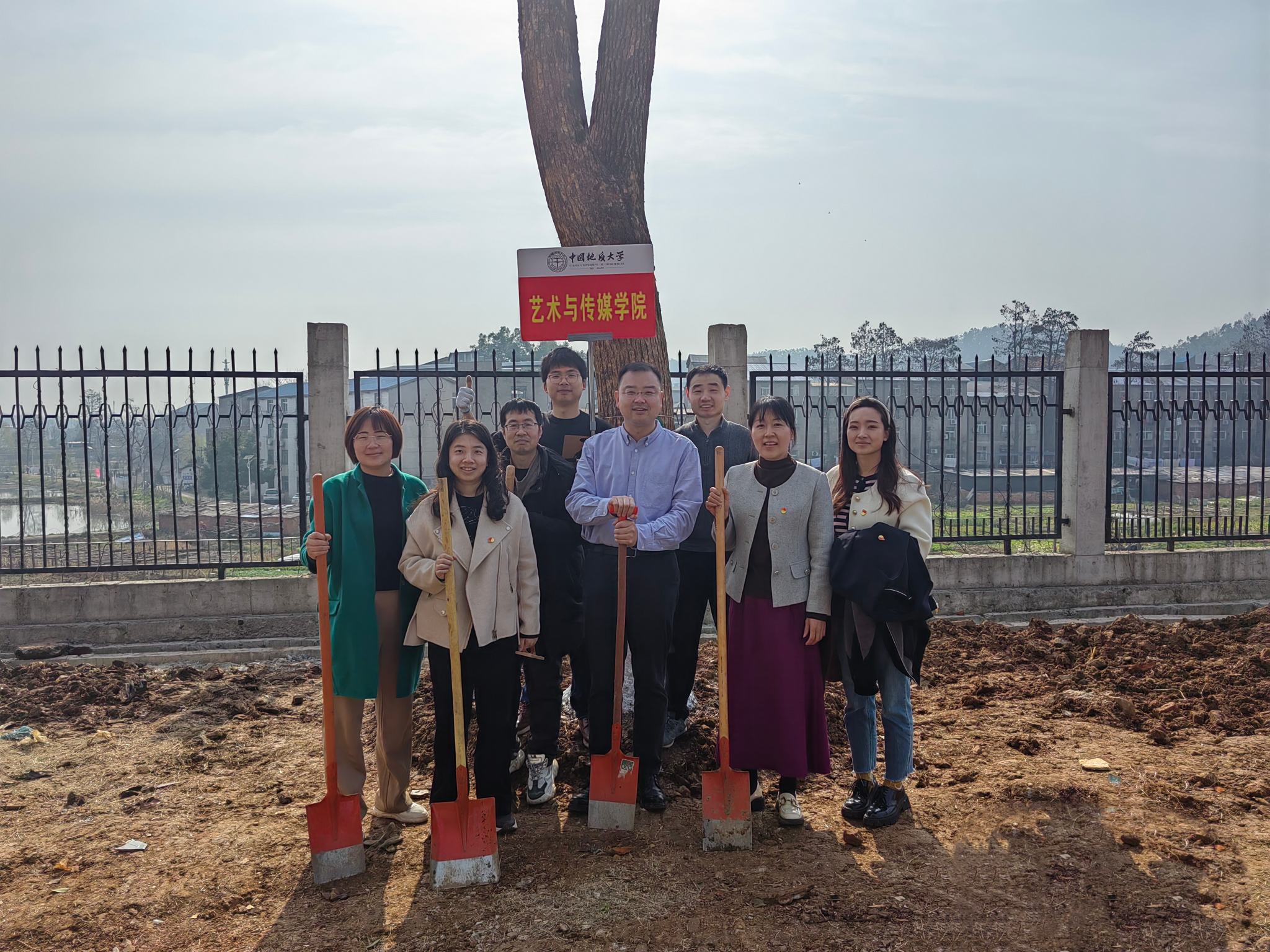 贝博体育 和学校办公室、党委组织部、党委统战部的老师们分为一组,大家互相配合,挥锹铲土、扶苗填坑、培土浇水并写下了植树节纪念牌,为建设美好地大校园贡献一份力量。