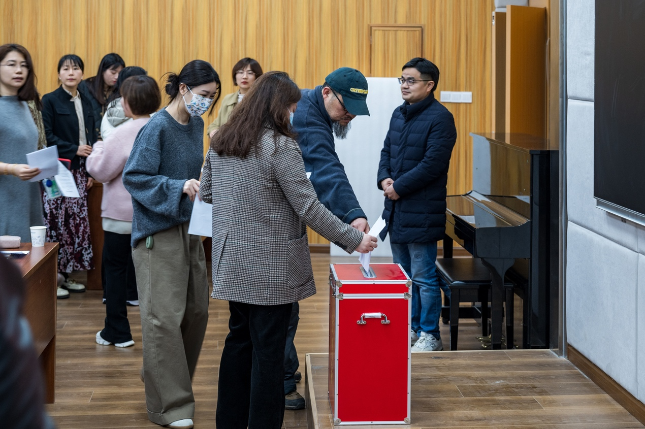 晋曦讲解了差额选举投票的相关要求。在慎重填写选票后,与会教职工轮流有序将选票投入了投票箱。在监票人的监督下,两位计票人汇总了得票情况。最终,何清俊、边建华、张梅珍、彭静、周黎和晋曦等六位教职工当选为出席学校第十届教职工代表大会暨第十九届工会会员代表大会代表。