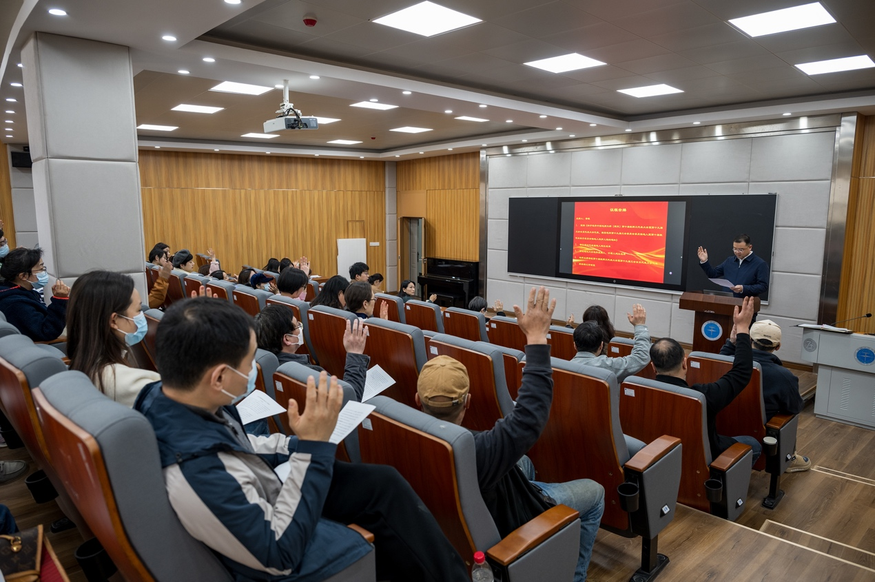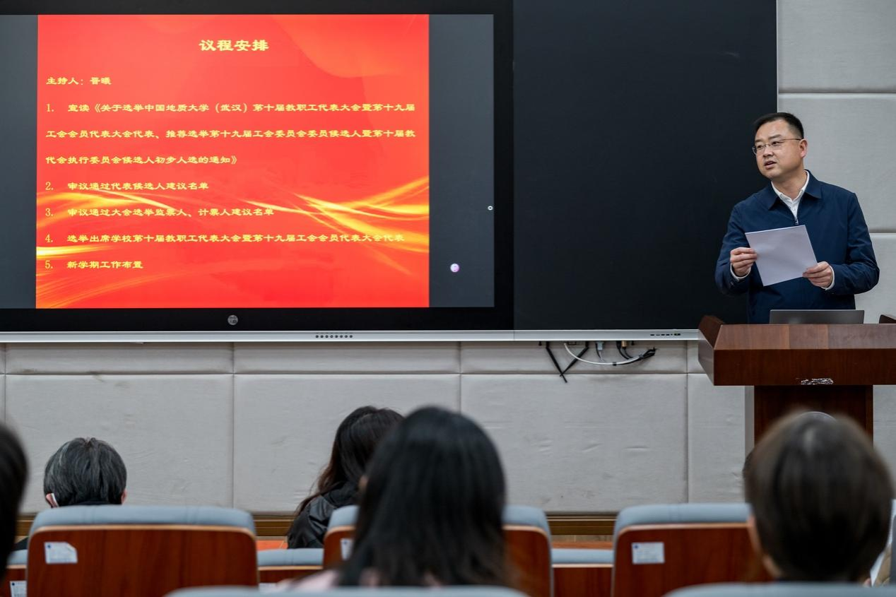 晋曦宣读了《关于选举中国地质大学(武汉)第十届教职工代表大会暨第十九届工会代表大会代表、推荐选举第十九届工会委员会委员候选人暨第十届教代会执行委员会候选人初步人员的通知》。通过举手投票的方式,与会教职工审议通过了代表候选人建议名单,审议通过了大会选举监票人、计票人建议名单。